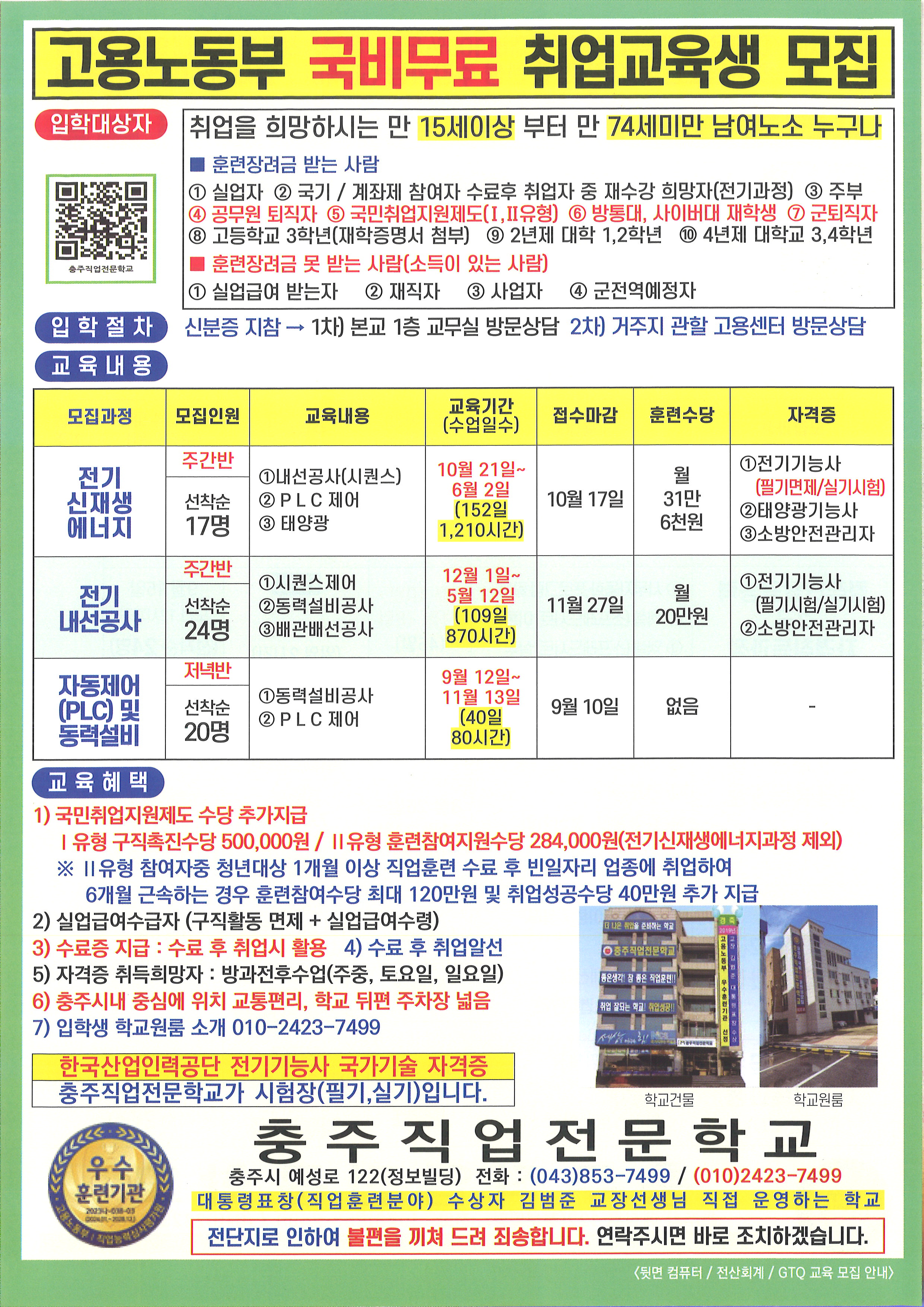 ※대상자별 추가 훈련장려금 043-853-7499 전화상담 바랍니다.